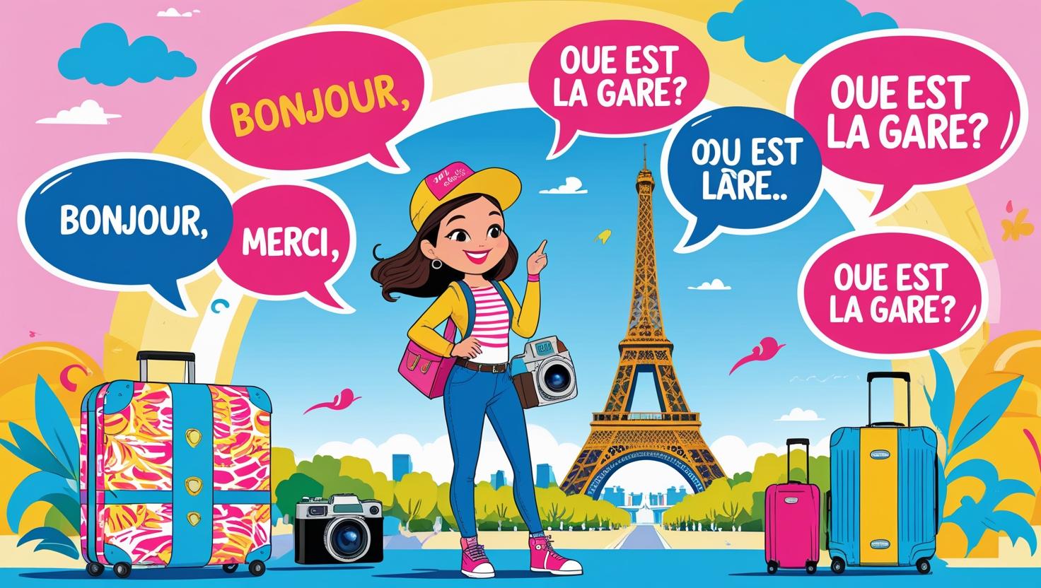 This animated digital illustration features a cheerful young traveler in Paris, standing in front of the Eiffel Tower. She’s surrounded by colorful speech bubbles displaying essential French phrases such as “Bonjour,” “Merci,” and “Où est la gare?”. Bright pink, blue, and yellow suitcases and cameras enhance the travel vibe, creating a fun, engaging visual perfect for a blog about French phrases every traveler should know.